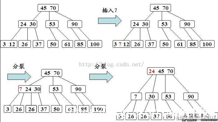 B-树是分阶的。所谓的阶,就是每个结点可以放多少个数据域。比如,3阶B-树,就是每个结点最多有3个数据域。有数据加入或者删减,那就要有所调整,甚至也许因为某结点放不下了,还要进行裂变。