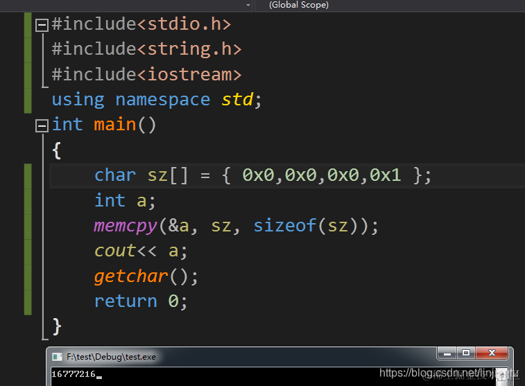 由于是一个字节一个字节拷贝,所以输出为0x10000000,十进制就为 16777216
