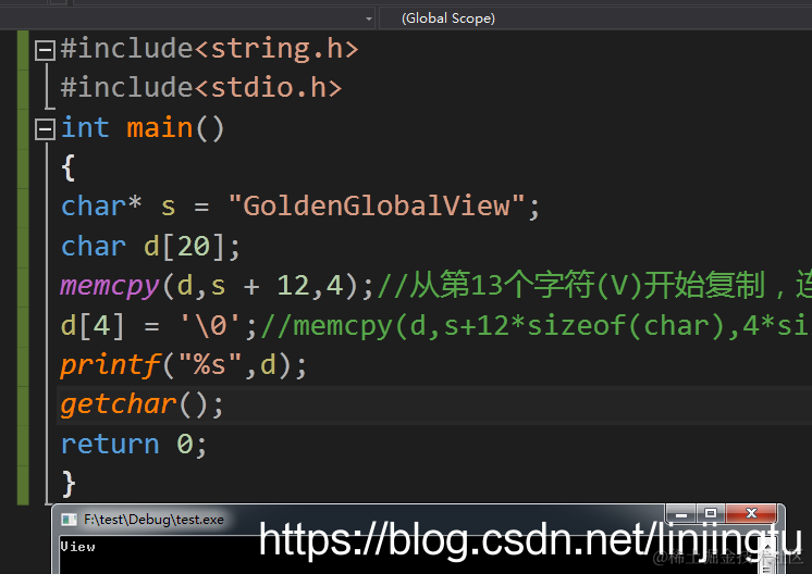 memcpy(d,s + 12,4);//从第13个字符(V)开始复制,连续复制4个字符(View)