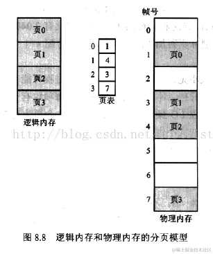 分页方案中,物理内存划分为固定大小的的块,称为帧(frame);与之对应,逻辑内存也分为同样大小的块,称为页。同样,备份存储也有同样大小的块。大小由硬件决定,通常为2的幂,以方便将逻辑地址转换为页号和页偏移。