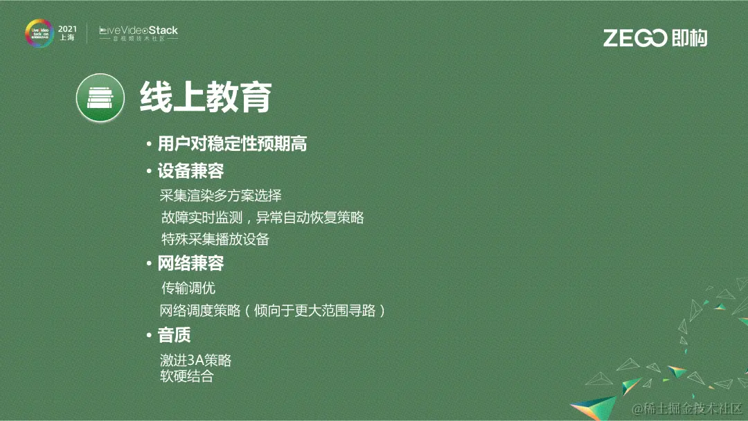 首先是教育场景,看起来非常普通的场景,没有特殊的玩法,最基本的要求是保持稳定的通话。这个场景大多是付费场景,用户付了钱,并且目的很明确,需要学到东西。任何一点阻碍他们沟通的问题都很烦人。有哪些东西比较容易出问题呢?分为两大类:第一是设备问题,教育场景有各种各样的设备;第二是网络兼容问题,怎样减少网络抖动和音视频卡顿。这里的设备主要是指采集设备和播放设备。如果采集失败了,那之后的环节都没有意义了,同样,如果渲染失败了,那前面的努力就白费了。
