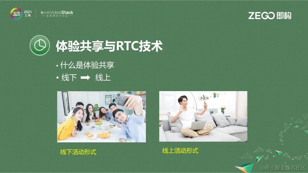 体验共享在线下是一个自然而然的概念,举几个体验共享的例子:大家在看电影时,喜剧片会一起笑,恐怖片会一起尖叫。共享体验需要立即看到对方的反馈,感受到对方,得到精神的放松并有所收获。第二个例子是线上教育,其实大多数人偏向线下教育,因为可以更好地互动,老师可以从学生的反应中得到信息并指导学生成长,学生之间也可以通过互动促进学习。以上例子的特征是都具有很强的互动性,大家可以看到对方的行为反应,获得某种感受、认知,并从中得到快乐、成长和学习。