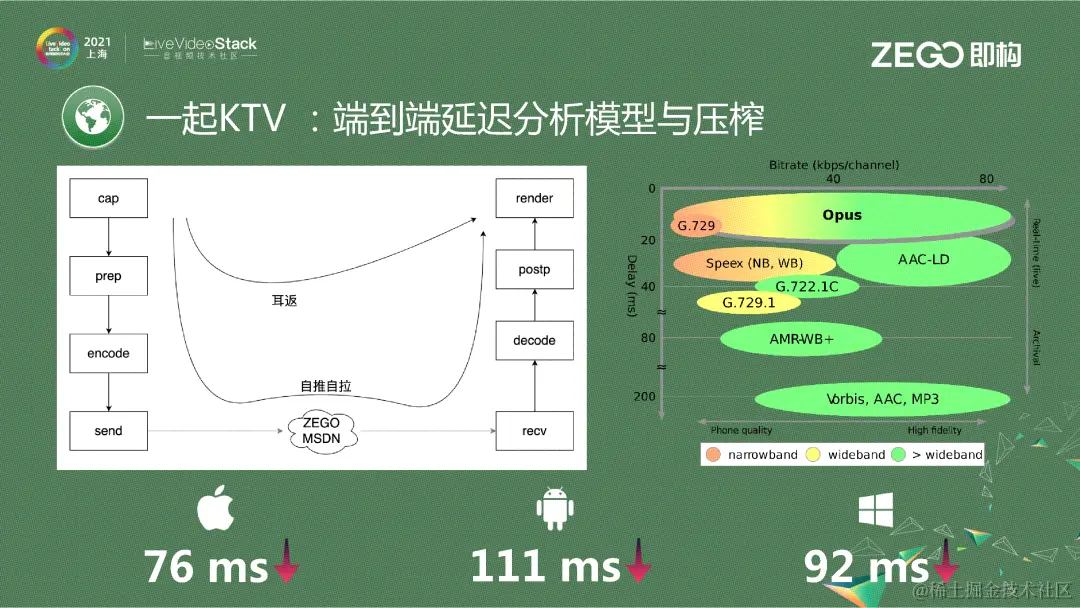 首先要做端到端时延的压榨,第一是分析链路情况,要做好事件的打点,从整个链路来说,包括采集、前处理、编码、传输、对端解码、后处理、渲染,这里的耳返时延是一个硬的约束,如果约束突破不了,时延有100ms或200ms,那么网络就不可用了,因为还要叠加下面一部分编解码和传输的时延。