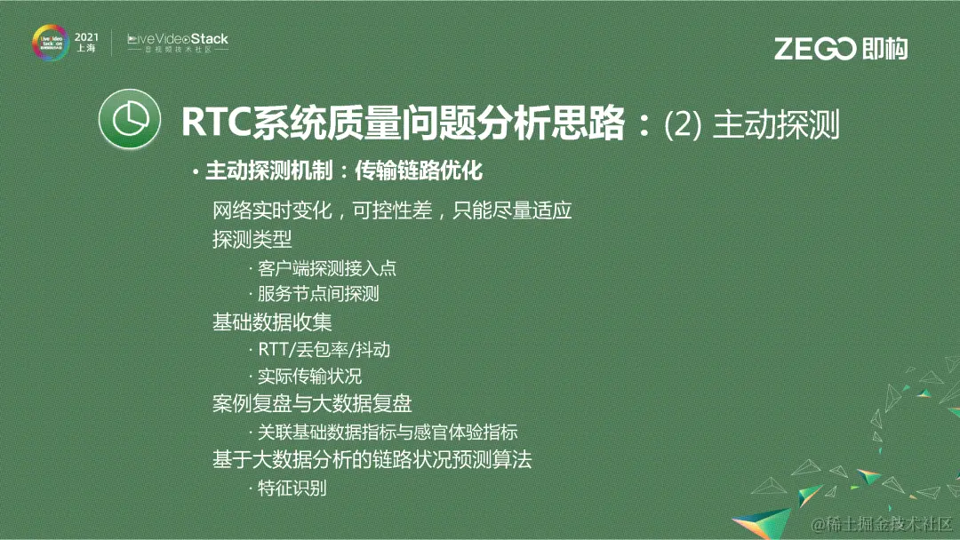 接下来介绍主动探测,这是一个基本的想法。对RTC系统来说,很重要的一部分是网络,而我们认为网络实际上非常复杂,复杂到无法控制,只能适应,这里的适应分两块:第一块是客户端到接入的服务器这一层如何适应;第二块是服务节点之间如何适应。