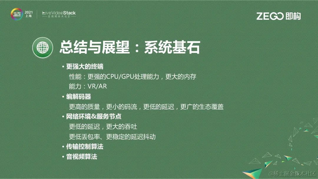 以上都是基于基础设施做的,优化方面除了功能优化,还要有基础设施的优化包括更好的Codec、更强大的终端、VR、AR帮助方案落地。LVS也搞过线上的大会,现在疫情缓和了,大家也来参加线下的大会了。当然一方面国内对疫情的控制做得很好,另一方面还是因为线下体验确实比线上更有吸引力,在线下能够更自由地交流。这其实也说明了线上体验确实还有很多值得改进的地方。如果有选择,大家会倾向于线上参加LVS大会吗?我相信随着基础设施的演进,我们在实际场景中历练方案,不但可以将线下个各种体验场景复刻到线上,还将演进出更多线上独有的体验,给大家更多的选择,做到真正的体验共享。希望整个行业一起努力,让音视频技术、RTC技术融入于生活无形。