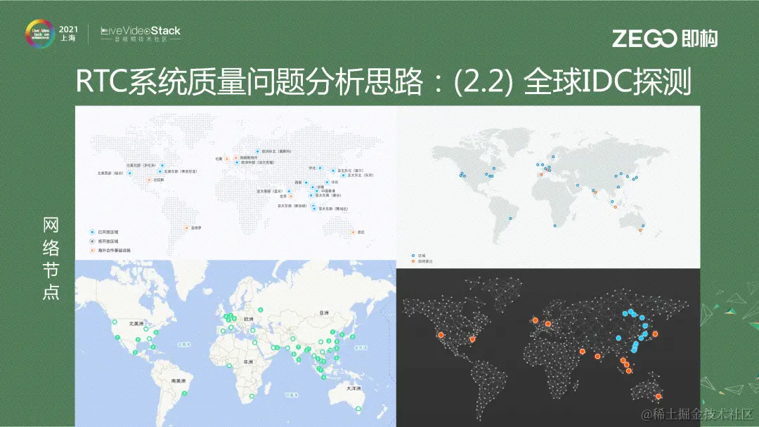 另外一个应用是SDN。SDN在即构RTC服务网络中的作用非常大。首先我们的架构是混合云,图中是我们的部分部分供应商的节点情况,包括腾讯云、阿里云、亚马逊、微软等,这些点是我们可以用的,那么如何管理这些点、找到足够好的链路也是需要思考的,比如从一端到另一端有足够好的RTT、足够少的丢包、足够稳的抖动等。