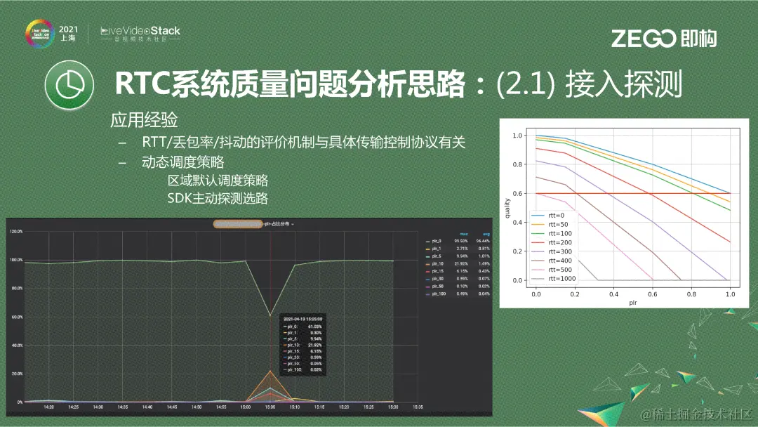 接入探测就是客户端到服务器探测的应用经验。黑色的图显示的是我们在某个区域监测网络质量的情况,以丢包率来看。最上面的线表示零丢包的情况,可以看到15:05时,零丢包率下降,掉到了接近60%,很难解释下降的原因,所以只能适应,那么如何适应呢,我们在SDK做了探测,如果发现这时的接入出现异常,那么考虑有无更好的连接点选择,SDK可以自主地找到更好的路。第二,SDK探测得到的信息还会用来指导服务调度策略调整,让后续其他用户不用重蹈覆辙。主要是两个策略,第一个是服务器下发的指导调度,反映综合最优,第二个是当遇到问题,调度服务吸收实时接入质量反馈,可以自动更新策略,恢复到正常水平。