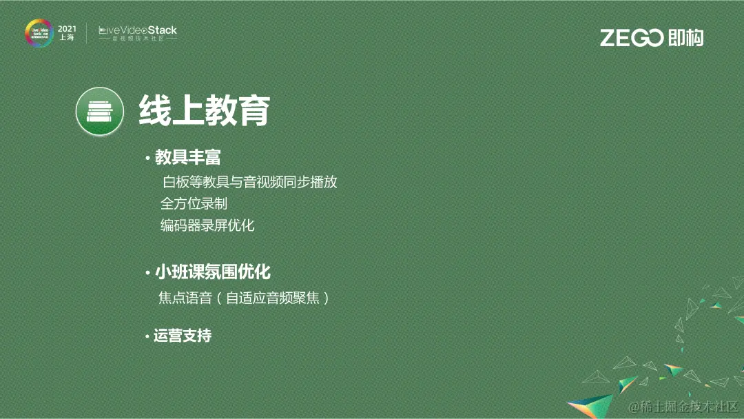 教育场景里,教具比较丰富,也有些特殊的需求,比如白板和音视频通常不走同一个通道,并且数据行为模式也不一致,如果不特殊处理,可能出现音视频和白板动作对不齐的情况,这个问题可以通过将时间戳埋到流中做同步来解决。录制也需要结合教具,即构提供了一套关于录制的方案,有各种选择。同时,教育场景有挺多屏幕共享的操作,有不少是文字的场景,我们针对性地做了编码优化,让文字更锐利。