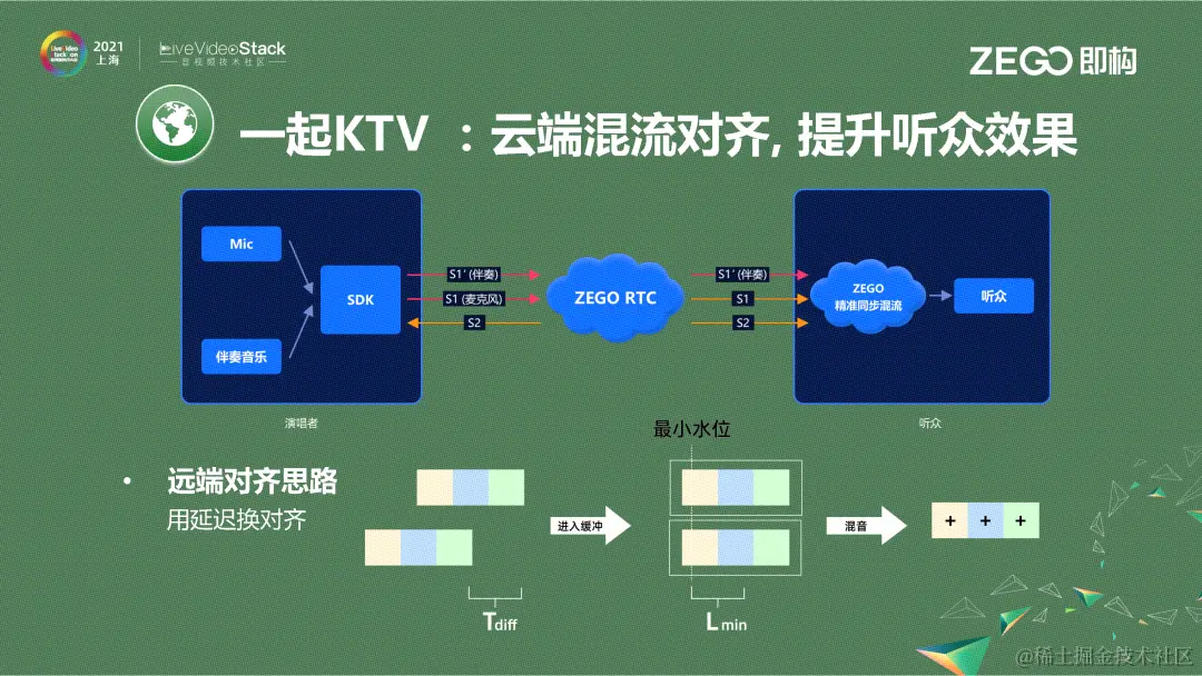 除了演唱者,还要从观众的角度来看。对观众的网络要求不能过高,因为大部分人网络都没有较好的保障,那如何做好观众效果?观众效果会遇到什么问题?比如演唱者的演唱已经非常同步,但是观众听到的不同步,原因包括观众与两个主播的距离不同,或是某人的网络突然抖动,总会存在一些不稳定的情况。我们的想法是在服务端将云端回流对齐,想法很基础,通过加缓冲,用延迟换对齐,另外还要加播放的伸缩让整个过程更平滑。