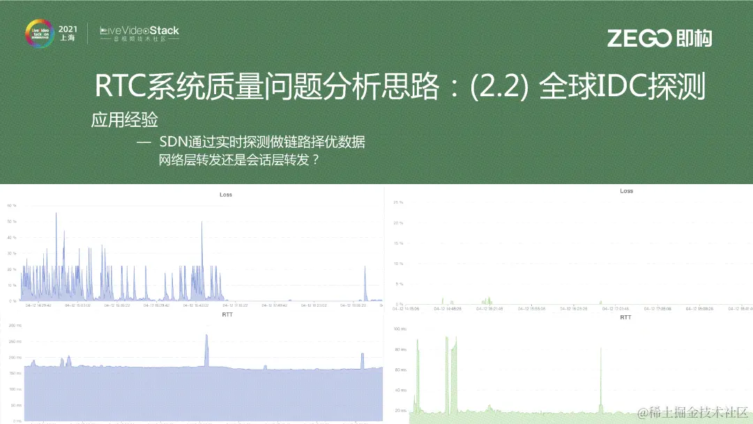 图中点虽然看起来下降很大,实际上是算法同时在补救,对业务来说、对整体上层体验来说影响不大。做探测的目的是不能让算法解决整件事情,算法只是应急使用,网络才是基础。虽然我们的传输控制算法能够在70% 丢包下工作,但我们不希望我们服务一直处于极限情况运作。这也是一个很基础的想法。