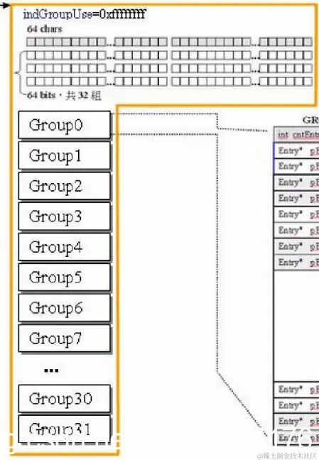 已知拥有32个group,对应了1MB的虚拟内存空间,平均下来每个group管理32KB内存。