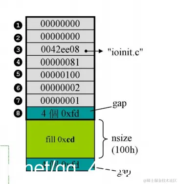 然后调整大小,扩充一个如下的结构:nDataSize记录真正大小。gap用户调试器检查保护nsize内存。注意gap一共上下两个,但是结构体里面只定义了上面的那个。