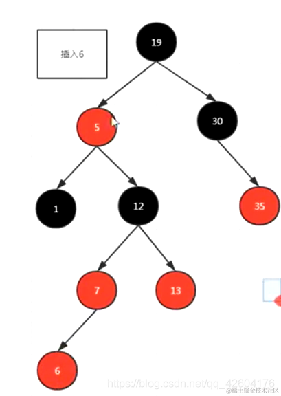 按照二叉搜索树的规则插入对应的结点6;发现违反规则了,两个红色的连到一起了,并且符合变色的前提,所以进行变色