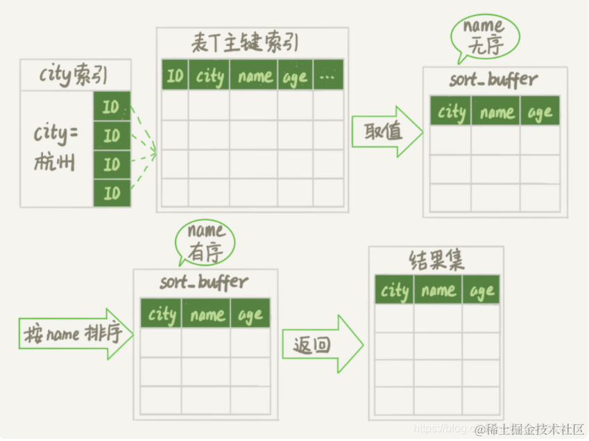 1、初始化sort_buffer,确定放入name、city、age三个字段;