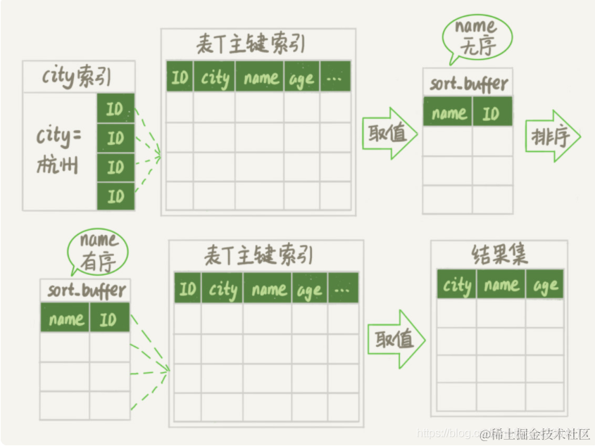 3、到主键id索引取出整行,取name、city、age三个字段值,存入sort_buffer;