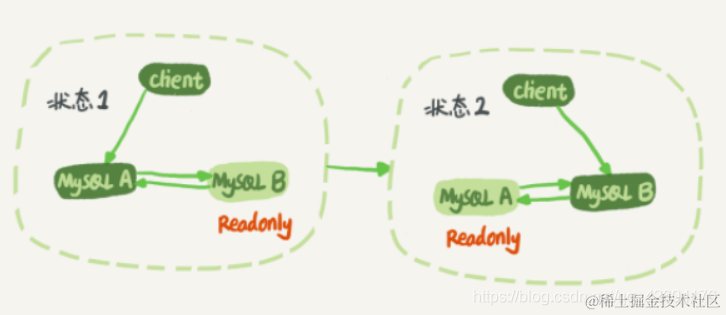 图1是M-S结构,但是现在常用的是M-M结构,M-M结构区别在于:节点A与节点B总是互为主备关系,所以在切换的时候就不用修改主备关系了。