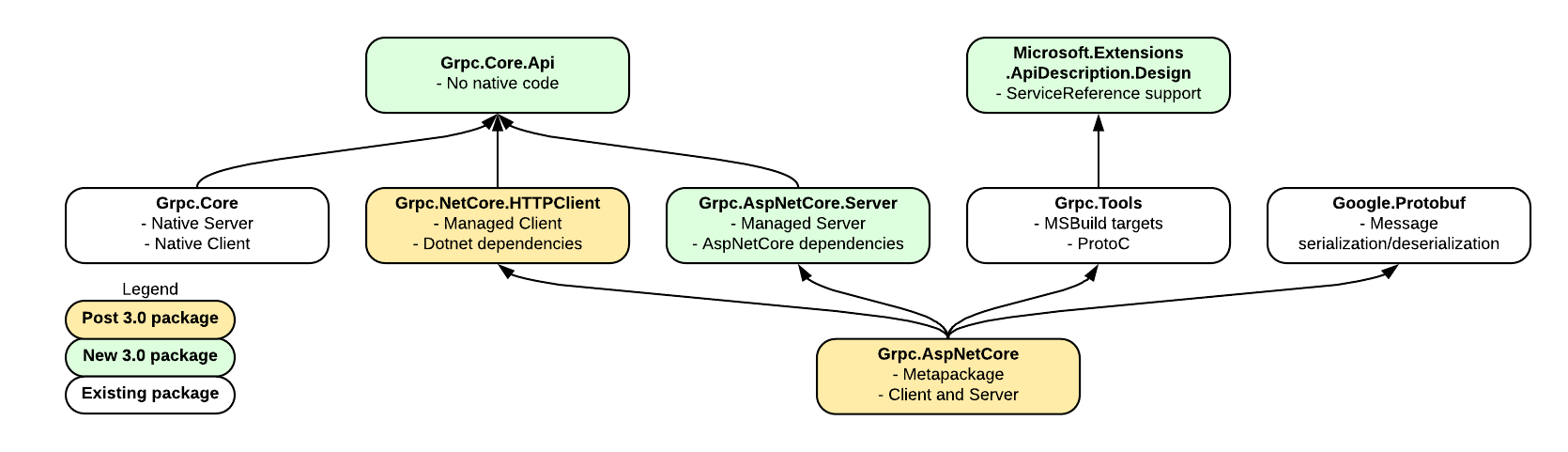 团队希望将它们与本机客户端和服务器区分开来,因此包名称将以Grpc.AspNetCore / Grpc.NetCore为前缀。我们不希望大多数用户直接依赖这些包,因此我们将使用由三部分组成的名称。