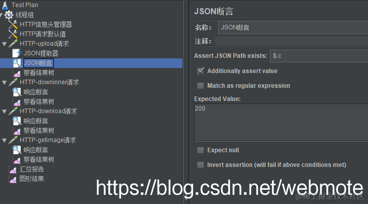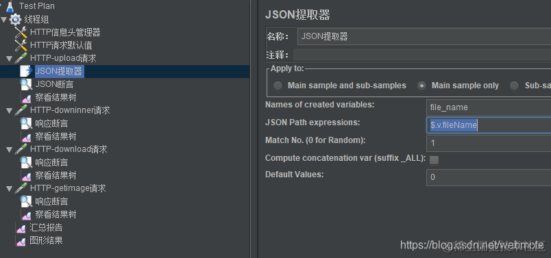 后台集成了FTP、SFTP和OSS三种操作方式,为了对其进行测试,使用Jmeter按照网上教程,编写了上传、下载和图片读取三种api测试,其中使用了json探测断言,变量。