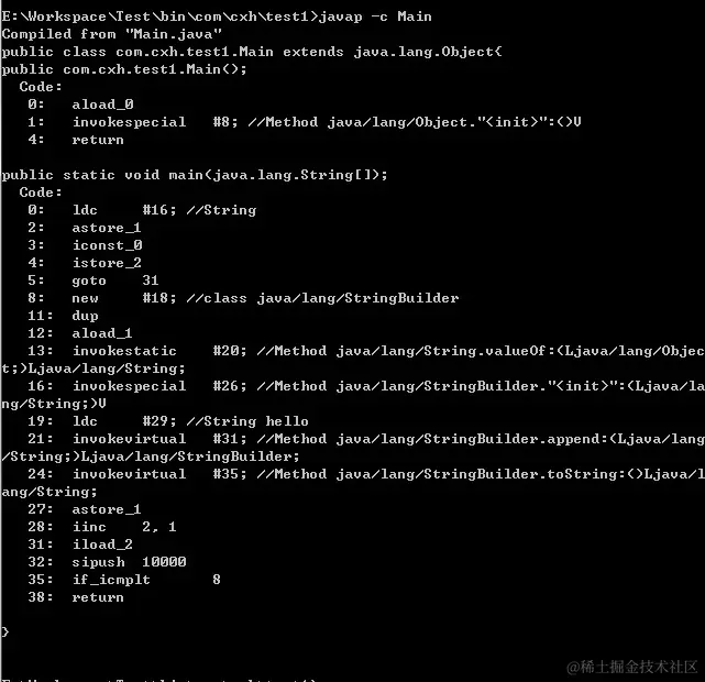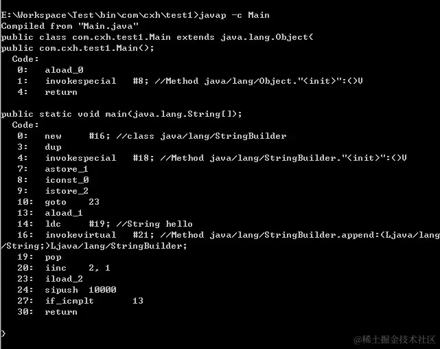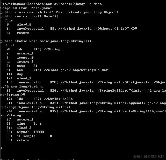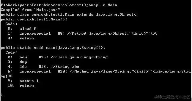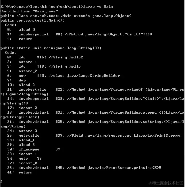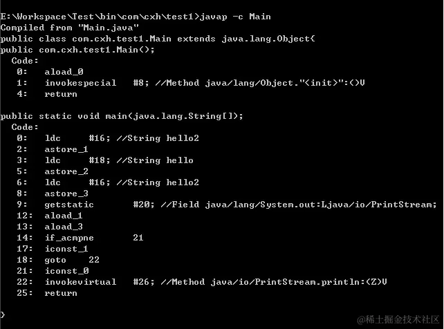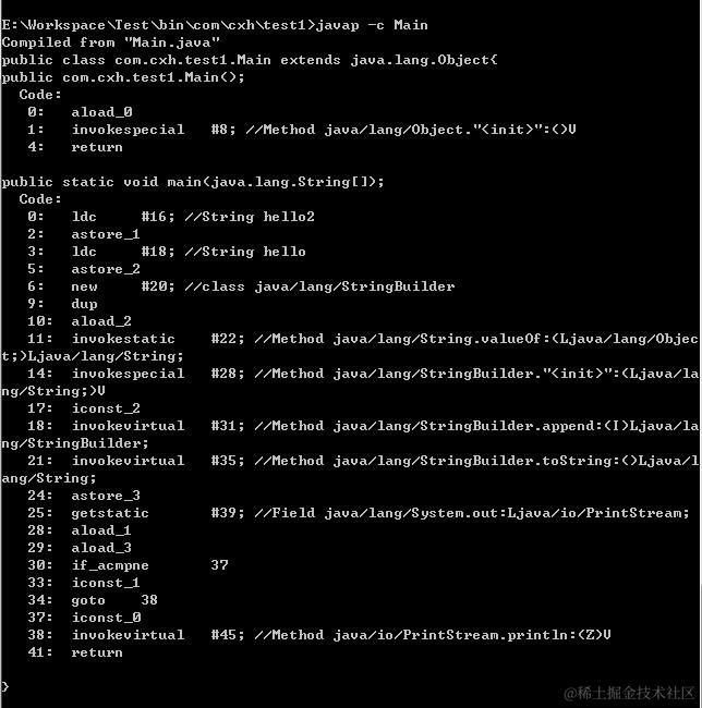 输出结果为:true。对于被final修饰的变量,会在class文件常量池中保存一个副本,也就是说不会通过连接而进行访问,对final变量的访问在编译期间都会直接被替代为真实的值。那么String c = b + 2;在编译期间就会被优化成:String c = "hello" + 2; 下图是javap -c的内容: