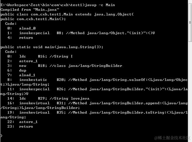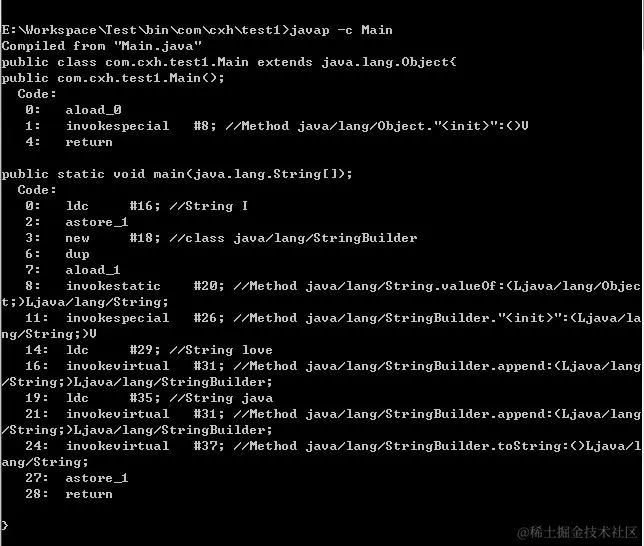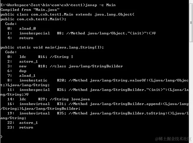 1)的效率比2)的效率要高,1)中的"love"+"java"在编译期间会被优化成"lovejava",而2)中的不会被优化。下面是两种方式的字节码: