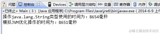 | 1234567891011121314151617181920212223242526272829303132 | public class Main {`` private static int time = 50000 ;`` public static void main(String[] args) {`` testString();`` testOptimalString();`` }`` public static void testString () {`` String s= "" ;`` long begin = System.currentTimeMillis();`` for ( int i= 0 ; i<time; i++){`` s += "java" ;`` }`` long over = System.currentTimeMillis();`` System.out.println( "操作" +s.getClass().getName()+ "类型使用的时间为:" +(over-begin)+ "毫秒" );`` }`` public static void testOptimalString () {`` String s= "" ;`` long begin = System.currentTimeMillis();`` for ( int i= 0 ; i<time; i++){`` StringBuilder sb = new StringBuilder(s);`` sb.append( "java" );`` s=sb.toString();`` }`` long over = System.currentTimeMillis();`` System.out.println( "模拟JVM优化操作的时间为:" +(over-begin)+ "毫秒" );`` }`` }`` |