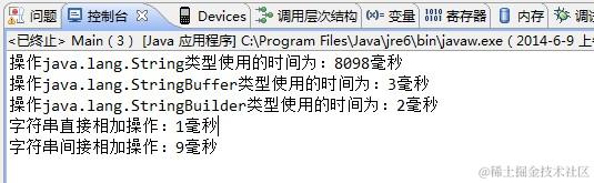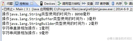| 123456789101112131415161718192021222324252627282930313233343536373839404142434445464748495051525354555657585960616263 | public class Main {`` private static int time = 50000 ;`` public static void main(String[] args) {`` testString();`` testStringBuffer();`` testStringBuilder();`` test1String();`` test2String();`` }`` public static void testString () {`` String s= "" ;`` long begin = System.currentTimeMillis();`` for ( int i= 0 ; i<time; i++){`` s += "java" ;`` }`` long over = System.currentTimeMillis();`` System.out.println( "操作" +s.getClass().getName()+ "类型使用的时间为:" +(over-begin)+ "毫秒" );`` }`` public static void testStringBuffer () {`` StringBuffer sb = new StringBuffer();`` long begin = System.currentTimeMillis();`` for ( int i= 0 ; i<time; i++){`` sb.append( "java" );`` }`` long over = System.currentTimeMillis();`` System.out.println( "操作" +sb.getClass().getName()+ "类型使用的时间为:" +(over-begin)+ "毫秒" );`` }`` public static void testStringBuilder () {`` StringBuilder sb = new StringBuilder();`` long begin = System.currentTimeMillis();`` for ( int i= 0 ; i<time; i++){`` sb.append( "java" );`` }`` long over = System.currentTimeMillis();`` System.out.println( "操作" +sb.getClass().getName()+ "类型使用的时间为:" +(over-begin)+ "毫秒" );`` }`` public static void test1String () {`` long begin = System.currentTimeMillis();`` for ( int i= 0 ; i<time; i++){`` String s = "I" + "love" + "java" ;`` }`` long over = System.currentTimeMillis();`` System.out.println( "字符串直接相加操作:" +(over-begin)+ "毫秒" );`` }`` public static void test2String () {`` String s1 = "I" ;`` String s2 = "love" ;`` String s3 = "java" ;`` long begin = System.currentTimeMillis();`` for ( int i= 0 ; i<time; i++){`` String s = s1+s2+s3;`` }`` long over = System.currentTimeMillis();`` System.out.println( "字符串间接相加操作:" +(over-begin)+ "毫秒" );`` }`` } |