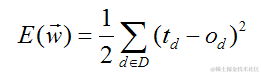 其中D是训练样例集合,td 是训练样例d的目标输出,od是线性单元对训练样例d的输出。E(w)是目标输出td和线性单元输出od的差异的平方在所有的训练样例上求和后的一半。我们定义E为w的函数,是因为线性单元的输出o依赖于这个权向量。