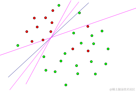 上图中,红点和绿点是线性不可分的(不能找到一条直线完全分开两类点),但是找到一条线能把两类点尽可能的分开。使错分的点尽可能地少。