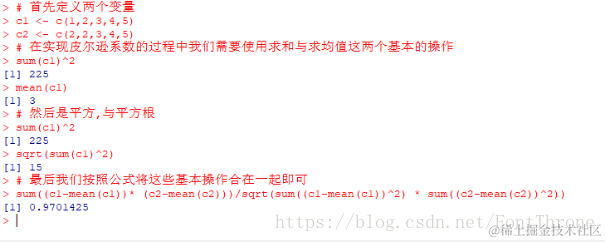 通过上面的这些操作,我们已经在R语言中是实现了皮尔逊系数的公式.如果有需要的话我们也可以将这个公式封装为我们自己的函数.只需要使用一条简单的语句声明即可.