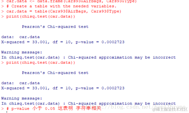 文中的前三行代码是从R语言中自带的数据库挑选出了汽车类型与安全气囊这两个数据,然后将其展示给了我们,而最后一行代码则使用”chisq.test()”函数对数据进行了卡方检验