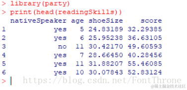 我们将使用名为readingSkills的R语言内置数据集来创建决策树。 它描述了某人的readingSkills的分数,如果我们知道变量“age”,“shoesize”,“score”,以及该人是否是母语。