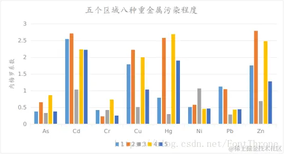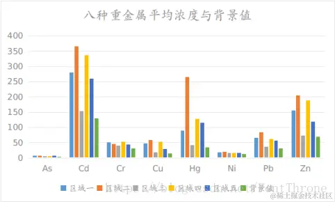 (1)由8种重金属元素在该城区的不同区域的分布情况图,我们可以清晰的了解到各区的重金属分布情况: