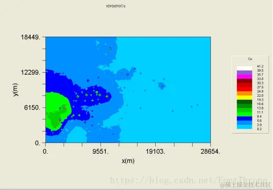由图可得:在坐标为(3276,6080);(2288,3794)这量点处铜含量较高。可推知铜污染源在这些区域内。