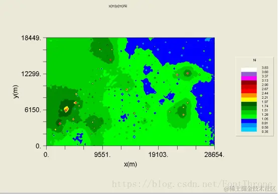 由图可得:在坐标为(3276,6080);(2288,3734);(22310,12109);(24078,12473);这几点处镍的含量较高。可推知镍污染源在这些区域内。