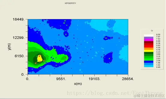 由图可得:在坐标为(3276,6080);(10661,5561);(4524,4573);(3536,4313);(2288,3794)这几点处铬含量较高。可推知铬污染源在这些区域内。
