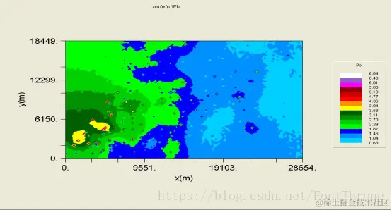 由图可得:在坐标为(2288,3794);(1508,2858);(4576,4573);(4056,2287)这几点处铅含量较高。可推知铅污染源在这些区域内。