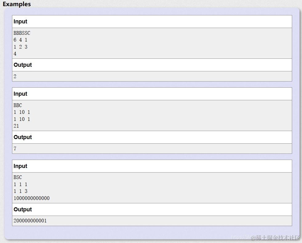 题目大意:有一种汉堡,用B、S、C三种原料做成,现在告诉你当前有的B、S、C的个数,到商店买的B、S、C的单价(商店无限供应这三种原料),还有你拥有的钱。问最多能做多少个汉堡。