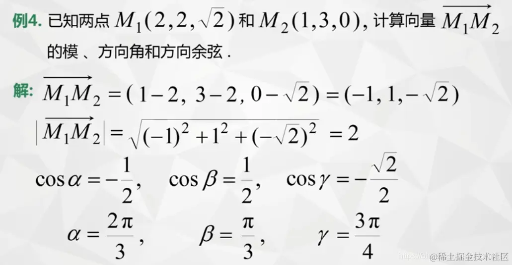 方向角:有向量 a ⃗ = ( a x , a y , a z ) \vec{a}=(a_x,a_y,a_z) a =(ax,ay,az),向量 a a a与 x x x轴的夹角为 α \alpha α,与 y y y轴的夹角为 β \beta β,与 z z z轴的夹角为 γ \gamma γ,则称 α \alpha α、 β \beta β、 γ \gamma γ为向量的方向角, cos α \cos\alpha cosα、 cos β \cos\beta cosβ、 cos γ \cos\gamma cosγ为向量的方向余弦。显然有 cos α = a x ∣ a ⃗ ∣ 、 cos β = a y ∣ a ⃗ ∣ 、 cos γ = a z ∣ a ⃗ ∣ \cos\alpha=\frac{a_x}{|\vec{a}|}、\cos\beta=\frac{a_y}{|\vec{a}|}、\cos\gamma=\frac{a_z}{|\vec{a}|} cosα=∣a ∣ax、cosβ=∣a ∣ay、cosγ=∣a ∣az。例题: