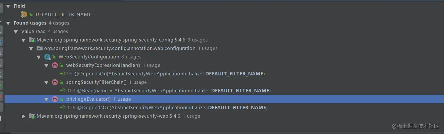 实际上到了这里,我们可以稍微总结一下,我们在Spring IoC容器外部配置了DelegatingFilterProxy,这个Filter执行拦截或者初始化时会去Spring上下文中根据名称和类型依赖查找获取Filter Bean,后续的拦截逻辑,由Filter Bean来完成,而Filter Bean我们根据对源码的定位,不难得知,其实就是FilterChainProxy;