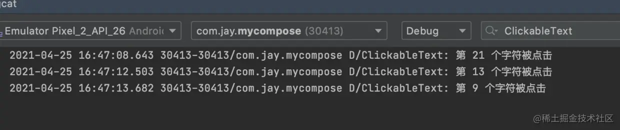 clickable可以给Text添加点击事件,但是它却不能监听点击的是Text的那个位置,比如显示的是Jetpack Compose,by 依然范特稀西,我想确定点击的是哪个字符,该咋整呢?Compose 为我们提供了支持,使用ClickableText即可: