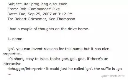 这是一封由 Rob Pike 在 2007 年 9 月 25 号,星期二,下午 3:12 回复给 Robert Griesemer、Ken Thompson 的有关编程语言讨论主题的邮件,邮件正文大意为:在开车回家的路上我得到了些灵感。1.给这门编程语言取名为“go”,它很简短,易书写。工具类可以命名为:goc、 gol、goa。交互式的调试工具也可以直接命名为“go”。语言文件后缀名为 .go 等等
