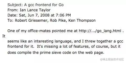 这是一封由 Ian Lance Taylor 在 2008 年 6月 7 日(星期六)的晚上 7:06 写给 Robert Griesemer、Rob Pike、 Ken Thompson 的关于 Go gcc 编译器前端的邮件。邮件正文大意如下:我的同事向我推荐了这个网站 http://…/go_lang.html 。这似乎是一门很有趣的编程语言。我为它写了一个 gcc 编译器前端。虽然这个工具仍缺少很多的功能,但它确实可以编译网站上展示的那个素数筛选程序了。