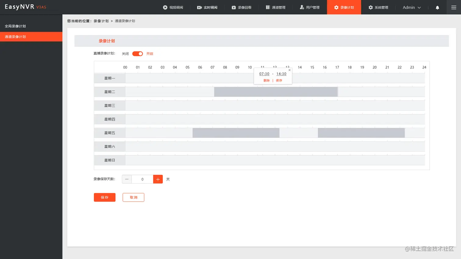 2、点击编辑按钮后,首先开启“直播录像计划”,然后在录像模板里设置您所需的录像计划、录像保存天数,最后点击保存即可。