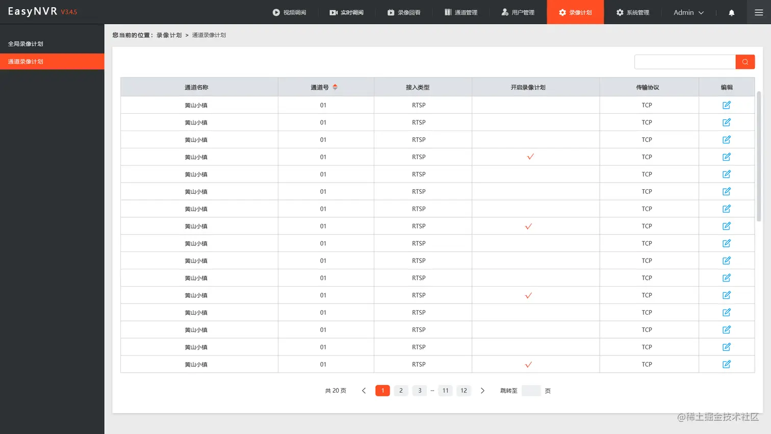 1、以管理员身份登录平台,点击顶部导航“录像计划”-“通道录像计划”,这时就会看到所有通道的列表信息,开启录像计划中的对号表示这个通道已经设置了录像计划,空白表示没有开启录像计划,需要在编辑里面设置。