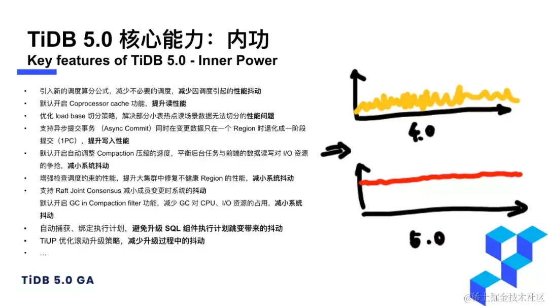 **从 4.0 版本到 5.0 版,TiDB 做了大量优化,包括减少性能抖动、提升性能、提升安全性等,上图中能看到这条黄色曲线最终变成了红色曲线,减少抖动将近 100 项。**对于一个企业级数据库来说,内功其实是非常重要的一个壁垒。