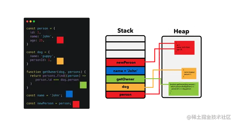 注意: 所有变量首先指向栈。如果它是非原始值,则栈包含对堆中对象数据的引用。