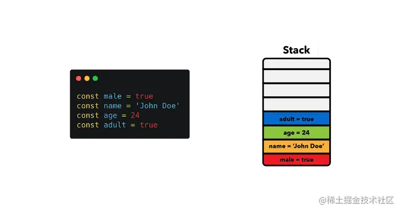 栈是JavaScript用于存储静态数据的数据类型结构,静态数据是引擎在编译时知道大小的数据。在JavaScript中,这包括指向对象和函数的引用和原始值(strings, numbers, booleans, undefined 和 null);