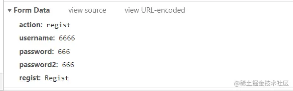 2.在这里,我们输入自己的姓名和密码,点击注册按钮。此时输入的这三个数据,我们可以看做成是一个表单的数据,这些数据会提交到服务器上: