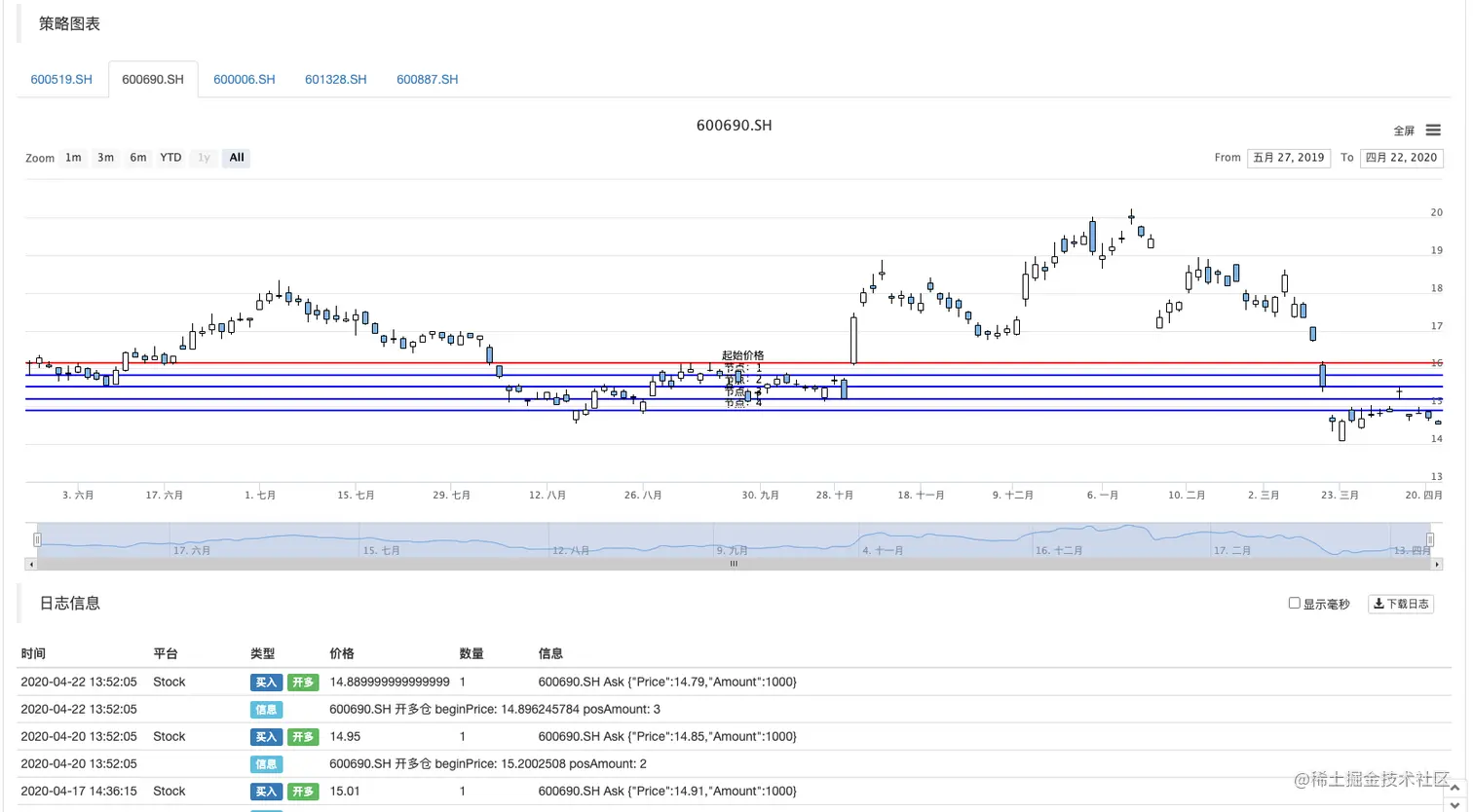 上一篇我们实现了一个简单的均线策略,本期我们一起来看如何实现一个网格策略。股票网格策略比较简单,相对于可以做多做空的期货,股票就只能做多了。网格策略就只能向下挂买单,分散持仓价格位置,持续低吸。等待到价格反弹逐笔平仓或者全部平仓。