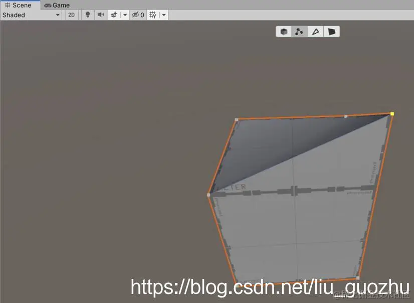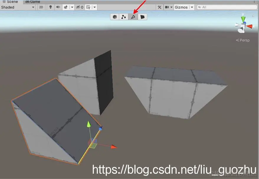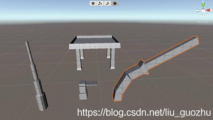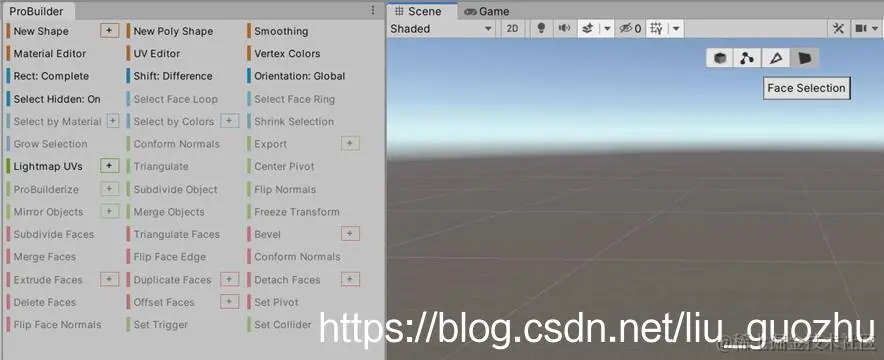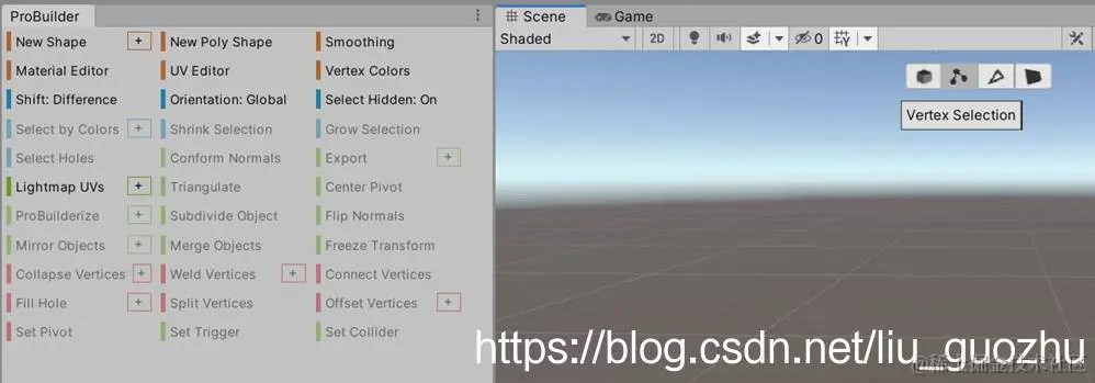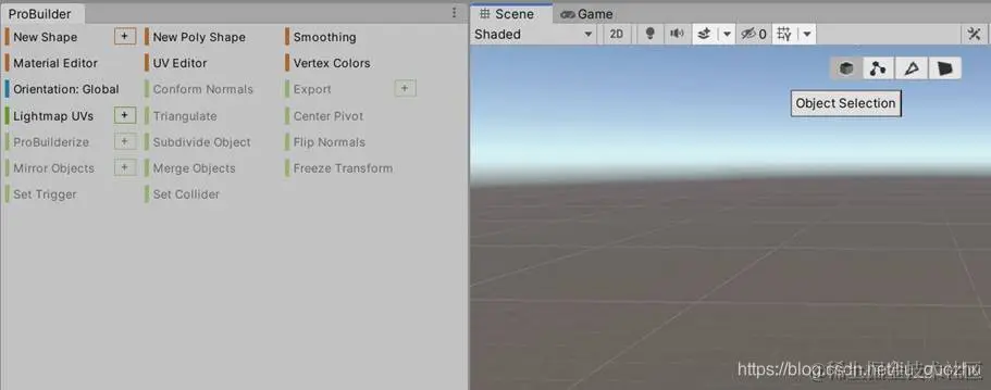 ProBuilder(以下简称: PB)功能安装后,在Unity的Scenes视图上方会出现四个操作按钮。这四个按钮是“Object Selection”、”Vertex Selection”、“Edge Selection” 、“Face Selection”,分别表示“对象选择”“顶点选择”“边沿选择”,“面选择”。